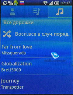 - Музыкальный плеер - тут есть некое подобие Mediascape, слушая композицию, можно нажать значок бесконечности, тогда загрузится дополнительная информация - например, ролик в YouTube. В остальном все типично для Android, есть просмотр исполнителей по алфавиту, списки воспроизведения, все треки. Воспроизведение в случайном порядке тоже есть. Кнопки управления плеером большие, удобные