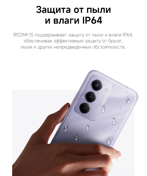 Камера Тройная камера Xiaomi Redmi 15 включает в себя стандартный объектив на 50,0 Мп с апертурой f/1,8 и технологией ISOCELL, портретный объектив на 2,0 Мп с апертурой f/2,4 и модуль для измерения глубины с разрешением 0,3 Мп. Фронтальная камера на 8,0 Мп с апертурой f/2,0 позволяет делать качественные селфи и проводить видеозвонки.